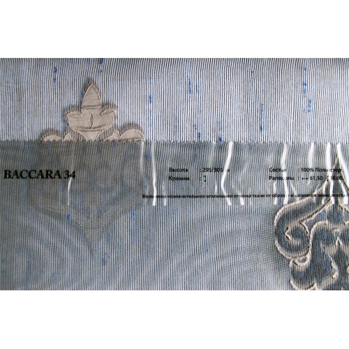 Купить тюль Baccara 34 в салонах штор Деколюкс можно на отрез, или с пошивом и навеской в Москве и Подмосковье, а так же с доставкой по России. Для этого свяжитесь, пожалуйста с нашими менеджерами по телефонам или по форме обратной связи. 10% СКИДКА на ткань и пошив при заказе тюля с пошивом от 6 м. в регионы России (за пределы Москвы и Московской Области) транспортной компанией СДЭК. Скидка действует до 10 июня 2021 г. и не суммируется с другими скидками и акциями!