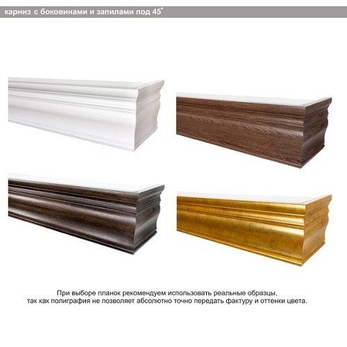 Карнизы могут быть прямыми, или с боковинами. Традиционно укомплектовываются пластиковыми 2 и 3-х рядными пластиковыми шинами. Возможно изготовление угловых или эркерных форм. Крепятся к потолку или к стене - с помощью кронштейнов, которые надо приобретать дополнительно в разделе "Комплектующие".