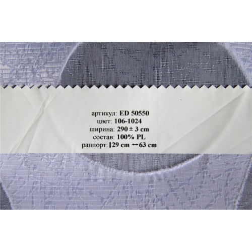Купить тюль ED 50550 106-1024 в салонах штор Деколюкс можно на отрез, или с пошивом и навеской в Москве и Подмосковье, а так же с доставкой по России. Для этого свяжитесь, пожалуйста с нашими менеджерами по телефонам или по форме обратной связи. 10% СКИДКА на ткань и пошив при заказе тюля с пошивом от 6 м. в регионы России (за пределы Москвы и Московской Области) транспортной компанией СДЭК. Скидка действует до 10 июня 2021 г. и не суммируется с другими скидками и акциями!