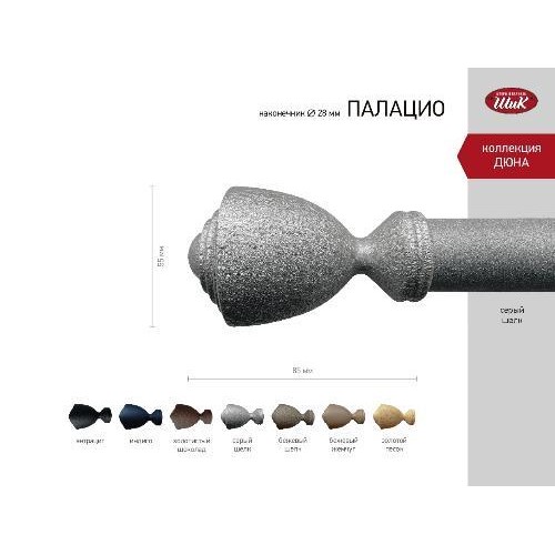 Коллекция современных карнизов "Дюна" фабрики ШИК (Тула). Наконечники, кронштейны, трубы и кольца окрашены порошковым покрытием, имитирующим песок или шелк. В коллекции 9 цветов - антрацит, индиго, золотой песок, золотистый шоколад, бежевый шёлк, серый шёлк, бежевый жемчуг, снежный, бронзовый бархан. В основу вмзуальной выразительности коллекции легли элементы классицизма, барокко и рококо.