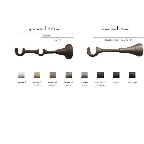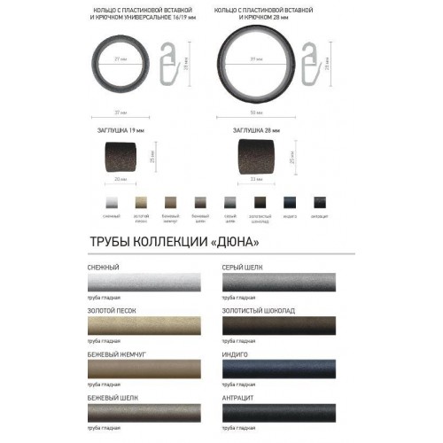 Коллекция современных карнизов "Дюна" фабрики ШИК (Тула). Наконечники, кронштейны, трубы и кольца окрашены порошковым покрытием, имитирующим песок или шелк. В коллекции 9 цветов - антрацит, индиго, золотой песок, золотистый шоколад, бежевый шёлк, серый шёлк, бежевый жемчуг, снежный, бронзовый бархан. В основу вмзуальной выразительности коллекции легли элементы классицизма, барокко и рококо.